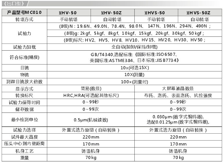 (6級)標(biāo)尺: HV1、HV5、HV10、HV20、HV30、HV50; |